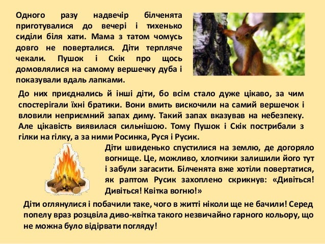 2.  Одного разу надвечір білченята приготувалися до вечері і тихенько сиділи біля хати. Мама з татом чомусь довго не поверталися. Діти терпляче чекали. Пушок і Скік про щось домовлялися на самому вершечку дуба і показували вдаль лапками. До них приєднались й інші діти, бо всім стало дуже цікаво, за чим спостерігали їхні братики. Вони вмить вискочили на самий вершечок і вловили неприємний запах диму. Такий запах вказував на небезпеку. Але цікавість виявилася сильнішою. Тому Пушок і Скік пострибали з гілки на гілку, а за ними Росинка, Руся і Русик. Діти швиденько спустилися на землю, де догоряло вогнище. Це, можливо, хлопчики залишили його тут і забули загасити. Білченята вже хотіли повертатися, як раптом Русик захоплено скрикнув: «Дивіться! Дивіться! Квітка вогню!» Діти оглянулися і побачили таке, чого в житті ніколи ще не бачили! Серед попелу враз розцвіла диво-квітка такого незвичайно гарного кольору, що не можна було відірвати погляду!