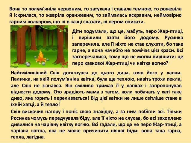 3.  Вона то полум’яніла червоним, то затухала і ставала темною, то рожевіла й іскрилася, то жевріла оранжевим, то займалась яскравим, неймовірно гарним кольором, що ні в казці сказати, ні пером описати. Діти подумали, що це, мабуть, перо Жар-птиці, і вирішили взяти його додому. Русинка заперечила, але її ніхто не став слухати, бо таке гарне, а вона начебто не помічає цієї краси. Всі засперечалися, тому що не могли вирішити: це перо казкової Жар-птиці чи квітка вогню? Найсміливіший Скік дотягнувся до цього дива, взяв його у лапки. Паличка, на якій полум’яніла квітка, була ще теплою, навіть трохи пекла, але Скік не зізнався. Він сміливо тримав її у лапках і запропонував віднести додому. Ото зрадіють мама з татом, коли побачать у хаті таке диво, яке горить і переливається! Від цієї квітки не лише світліше стане в їхній хатці, а й тепло! Скік вискочив нагору і поніс свою знахідку, а за ним побігли всі. Тільки Росинка чомусь передчувала біду, але її ніхто не слухав, бо всі захоплено дивилися на чарівну квітку вогню. Всі гадали, що це не перо Жар-птиці, а чарівна квітка, яка не може причинити ніякої біди: вона така гарна, тепла, лагідна.