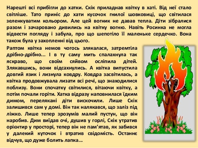 4.  Нарешті всі прибігли до хатки. Скік приладнав квітку в хаті. Від неї стало світліше. Тато приніс до хати кусочок гнилої шовковиці, що світилася зеленкуватим кольором. Але цей вогник не давав тепла. Діти зібралися разом і зачаровано дивились на квітку вогню. Навіть Росинка не могла відвести погляду і забула, про що шепотіло її маленьке сердечко. Вона також була у захопленні від цього. Раптом квітка немов чогось злякалася, затремтіла дрібно-дрібно... І в ту саму мить спалахнула так яскраво, що своїм сяйвом осліпила дітей. Злякавшись, вони відсахнулись. А квітка випустила довгий язик і лизнула ковдру. Ковдра засвітилась, а квітка продовжувала лизати всі речі, що знаходилися поблизу. Вони спочатку світилися, вітаючи квітку, а потім почали горіти. Хатка відразу наповнилася їдким димом, перелякані діти вискочили. Лише Скік залишився сам у домі. Він так налякався, що заліз під ліжко. Лише тепер зрозумів малий пустун, що він наробив. Дим виїдав очі, душив у горлі, Скік утратив орієнтир у просторі, тепер він не пам’ятав, як забився у далекий куточок і втратив свідомість. Останнє відчув, що дуже болить лапка...