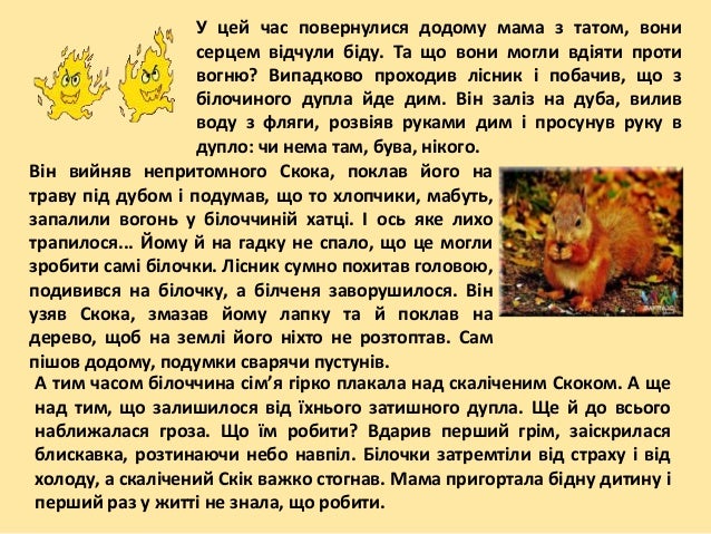 5. У цей час повернулися додому мама з татом, вони серцем відчули біду. Та що вони могли вдіяти проти вогню? Випадково проходив лісник і побачив, що з білочиного дупла йде дим. Він заліз на дуба, вилив воду з фляги, розвіяв руками дим і просунув руку в дупло: чи нема там, бува, нікого. Він вийняв непритомного Скока, поклав його на траву під дубом і подумав, що то хлопчики, мабуть, запалили вогонь у білоччиній хатці. І ось яке лихо трапилося... Йому й на гадку не спало, що це могли зробити самі білочки. Лісник сумно похитав головою, подивився на білочку, а білченя заворушилося. Він узяв Скока, змазав йому лапку та й поклав на дерево, щоб на землі його ніхто не розтоптав. Сам пішов додому, подумки сварячи пустунів. А тим часом білоччина сім’я гірко плакала над скаліченим Скоком. А ще над тим, що залишилося від їхнього затишного дупла. Ще й до всього наближалася гроза. Що їм робити? Вдарив перший грім, заіскрилася блискавка, розтинаючи небо навпіл. Білочки затремтіли від страху і від холоду, а скалічений Скік важко стогнав. Мама пригортала бідну дитину і перший раз у житті не знала, що робити.