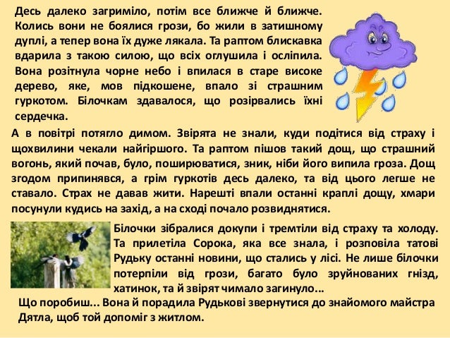 6. Десь далеко загриміло, потім все ближче й ближче. Колись вони не боялися грози, бо жили в затишному дуплі, а тепер вона їх дуже лякала. Та раптом блискавка вдарила з такою силою, що всіх оглушила і осліпила. Вона розітнула чорне небо і впилася в старе високе дерево, яке, мов підкошене, впало зі страшним гуркотом. Білочкам здавалося, що розірвались їхні сердечка. А в повітрі потягло димом. Звірята не знали, куди подітися від страху і щохвилини чекали найгіршого. Та раптом пішов такий дощ, що страшний вогонь, який почав, було, поширюватися, зник, ніби його випила гроза. Дощ згодом припинявся, а грім гуркотів десь далеко, та від цього легше не ставало. Страх не давав жити. Нарешті впали останні краплі дощу, хмари посунули кудись на захід, а на сході почало розвиднятися. Білочки зібралися докупи і тремтіли від страху та холоду. Та прилетіла Сорока, яка все знала, і розповіла татові Рудьку останні новини, що стались у лісі. Не лише білочки потерпіли від грози, багато було зруйнованих гнізд, хатинок, та й звірят чимало загинуло... Що поробиш... Вона й порадила Рудькові звернутися до знайомого майстра Дятла, щоб той допоміг з житлом.