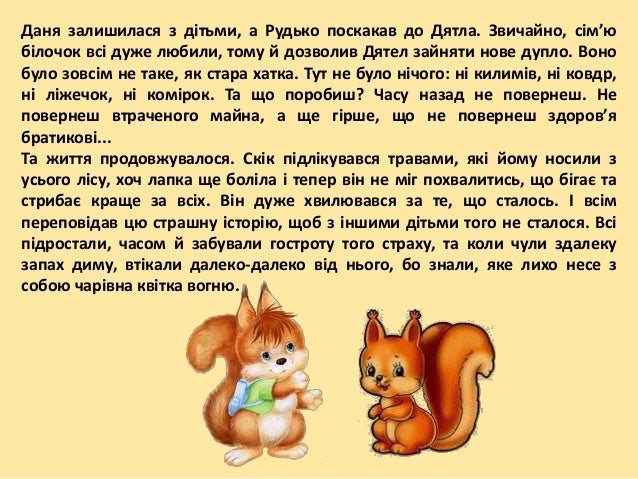 7.  Даня залишилася з дітьми, а Рудько поскакав до Дятла. Звичайно, сім’ю білочок всі дуже любили, тому й дозволив Дятел зайняти нове дупло. Воно було зовсім не таке, як стара хатка. Тут не було нічого: ні килимів, ні ковдр, ні ліжечок, ні комірок. Та що поробиш? Часу назад не повернеш. Не повернеш втраченого майна, а ще гірше, що не повернеш здоров’я братикові... Та життя продовжувалося. Скік підлікувався травами, які йому носили з усього лісу, хоч лапка ще боліла і тепер він не міг похвалитись, що бігає та стрибає краще за всіх. Він дуже хвилювався за те, що сталось. І всім переповідав цю страшну історію, щоб з іншими дітьми того не сталося. Всі підростали, часом й забували гостроту того страху, та коли чули здалеку запах диму, втікали далеко-далеко від нього, бо знали, яке лихо несе з собою чарівна квітка вогню.